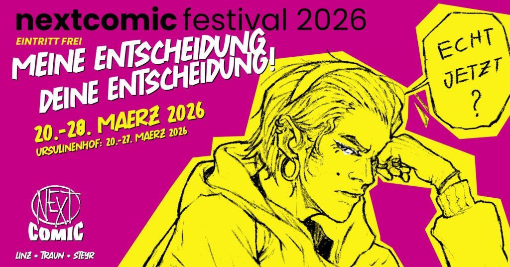 The exhibition is part of a broader festival program that explores comics in dialogue with illustration, film, literature, and other visual arts, positioning the medium within a contemporary artistic framework. ART:9’s exhibition is also featured in ORF’s Oberösterreich heute coverage of the Nextcomic Festival, available at on.orf.at until April 19.